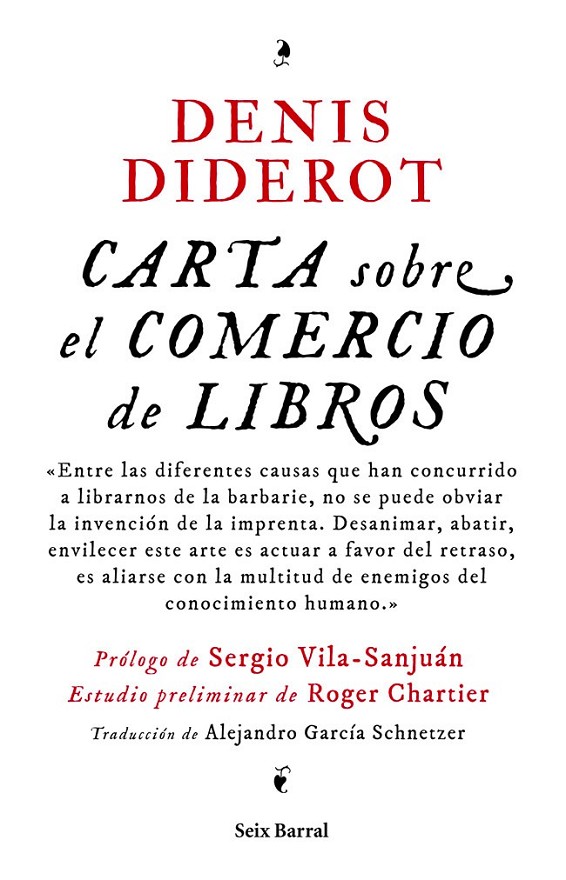 La Carta sobre el comercio de libros es un ensayo breve escrito por Denis Diderot a petición de los libreros parisinos en 1763. La finalidad de la obra era presentar ante las autoridades de la época una defensa del gremio contra los prejuicios y restricciones de su comercio. Pero el texto se convierte en mucho más que eso, y su discurso cobra una asombrosa vigencia: una lúcida crítica contra la censura del Estado y un alegato a favor de la propiedad intelectual. En el actual contexto de incertidumbre respecto al futuro del libro, la irrupción de lo digital, las amenazas a la propiedad intelectual y la crisis que se cierne sobre el sector, éste es un texto necesario para todos los amantes de la literatura: libreros, escritores, editores y lectores en general.