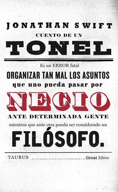 40 grandes ideas que han cambiado el mundo. Esta fábula indecente y exuberante es una original sátira sobre la política, el exceso religioso, la moda, la locura y el acto de escribir. Mediante el arma de la parodia, Swift emprende una crítica del entusiasmo, el orgullo y la credulidad. A lo largo ...