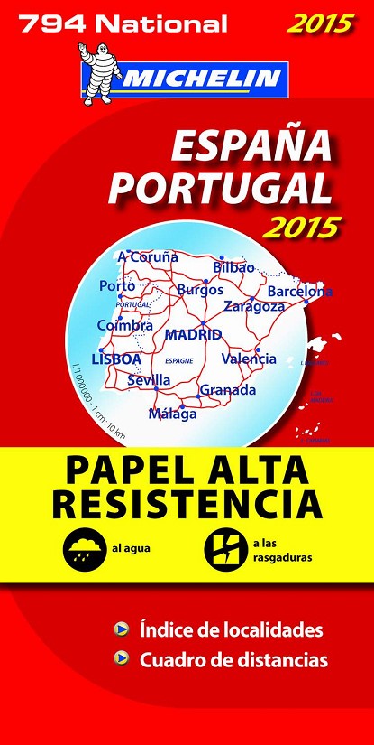 La edición actualizada del mapa National ?Alta Resistencia? España Portugal, editado a escala 1/1 000 000, está fabricado en un papel especial que le confiere una mayor resistencia al agua, así como a las rasgaduras. Además, incorpora un índice de localidades y un cuadro de distancias.
