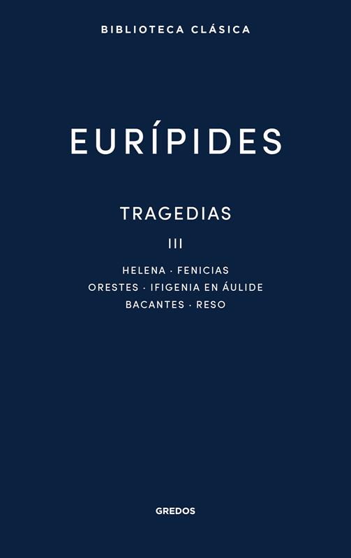 El tercer y último volumen que recoge las tragedias completas de Eurípides en la Biblioteca Clásica incluye: Helena, Las fenicias, Orestes, Ifigenia en Áulide, Las bacantes y la debatida Reso.